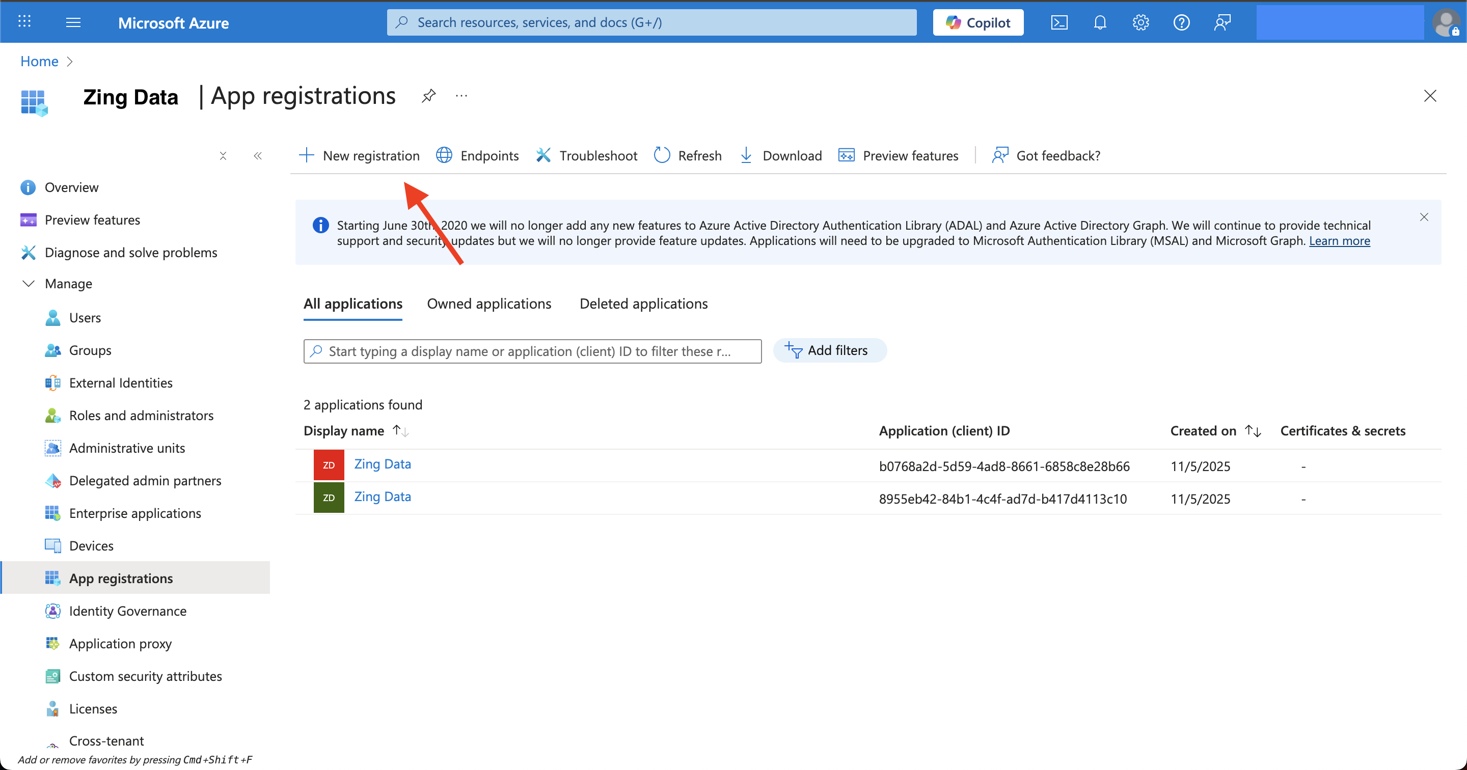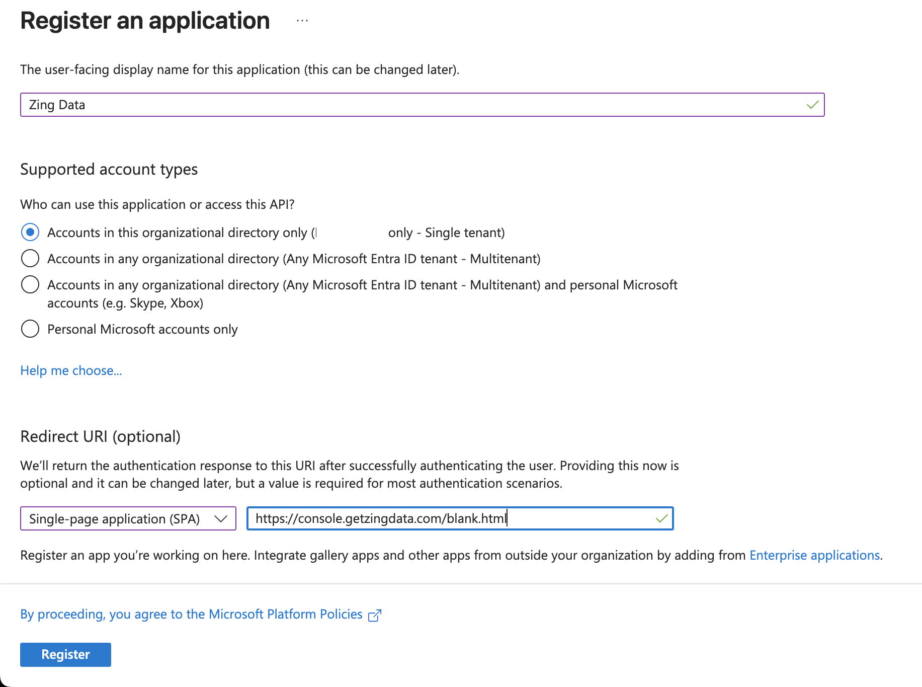 As a last step, please click on Overview in the left side menu and copy the Application (client) ID and Directory (tenant) ID values and send these values to the Zing Data enterprise support team to complete the integration.