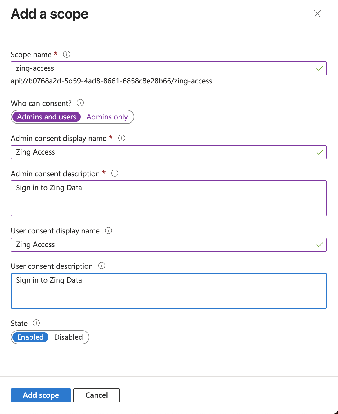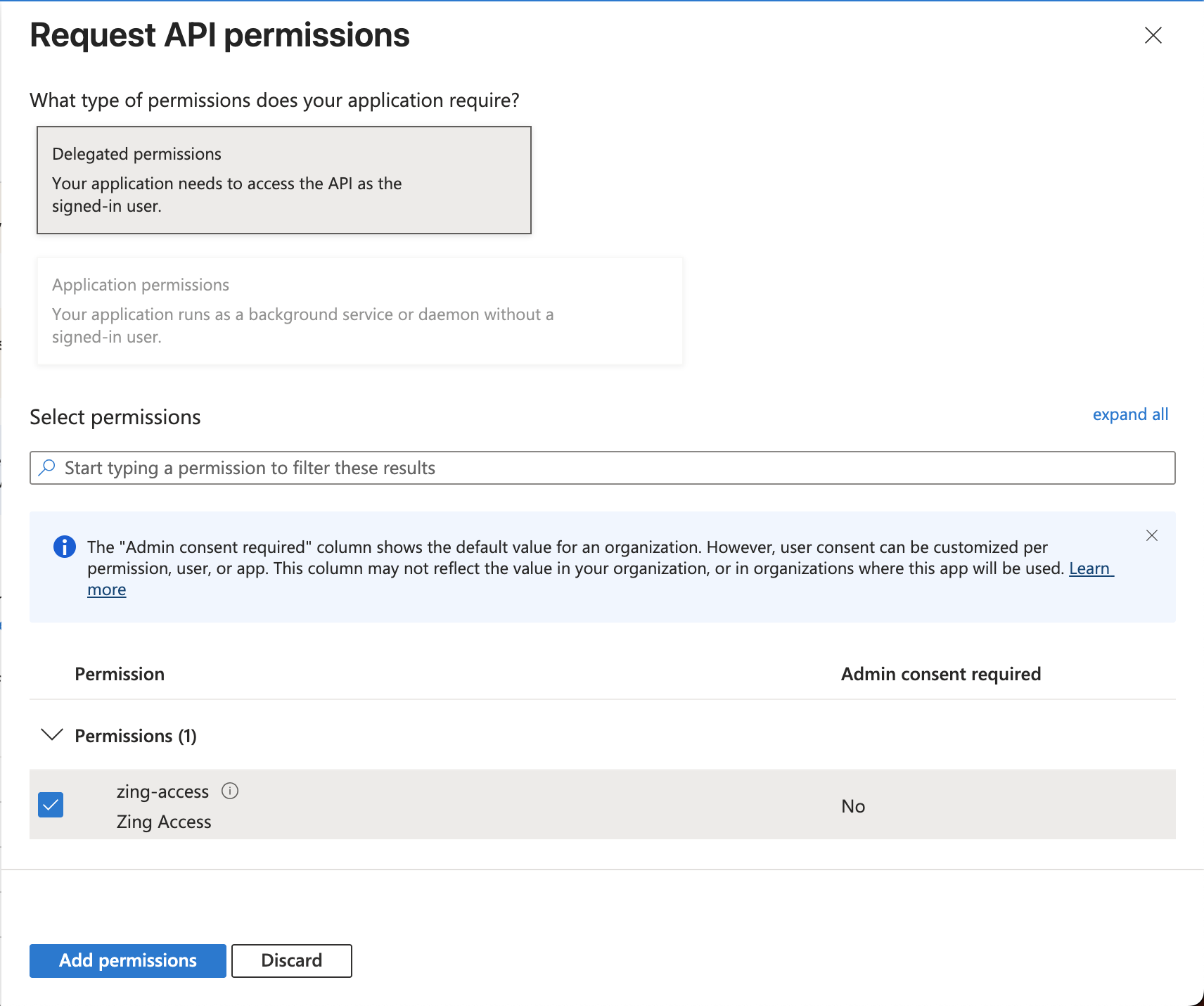 - Click again in Delegated permissions and select the Zing Access permission and then click Add permissions.