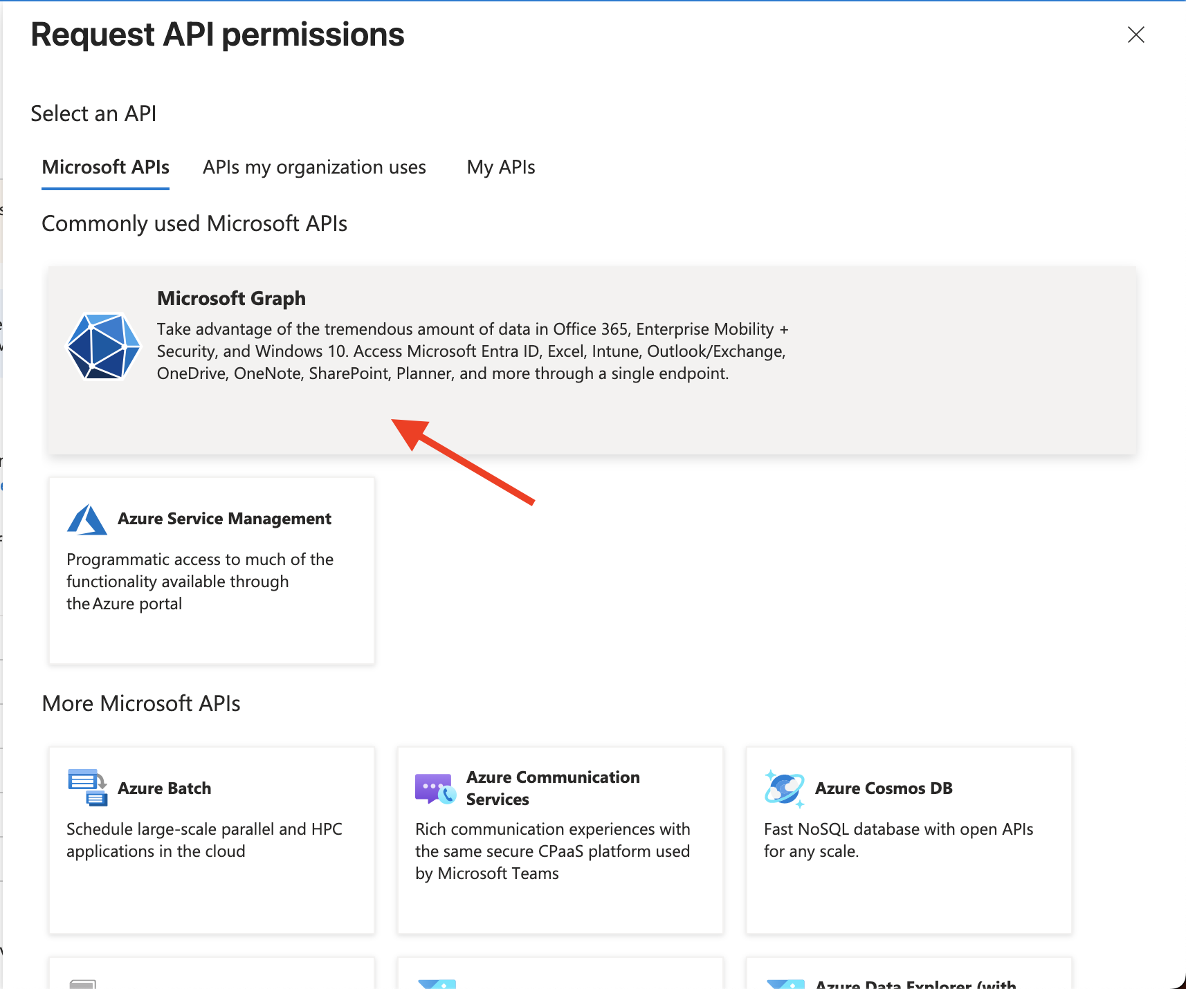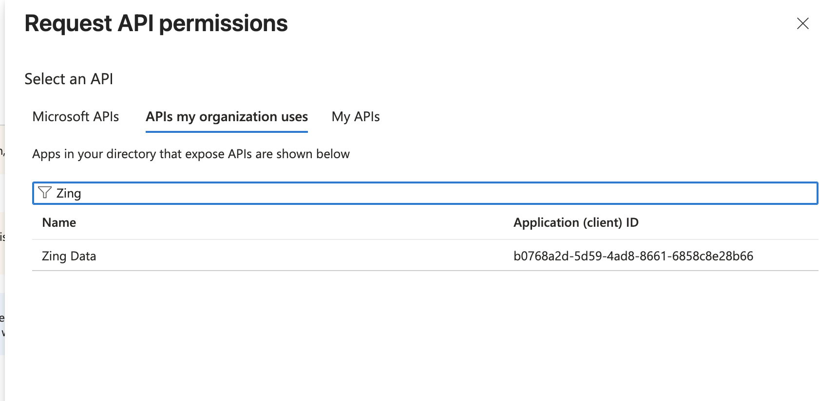 - Click on Add a permission again, but this time switch to the second tab on top APIs my organization uses and find the Zing Data API previously created.