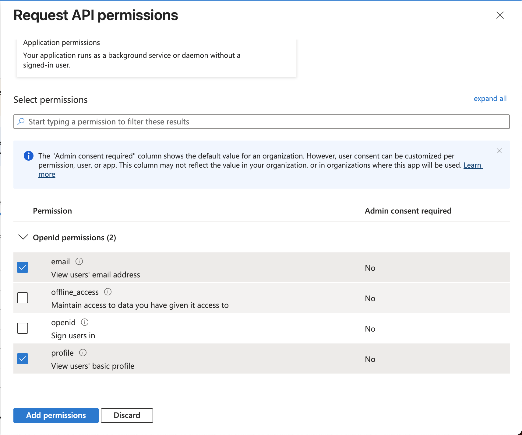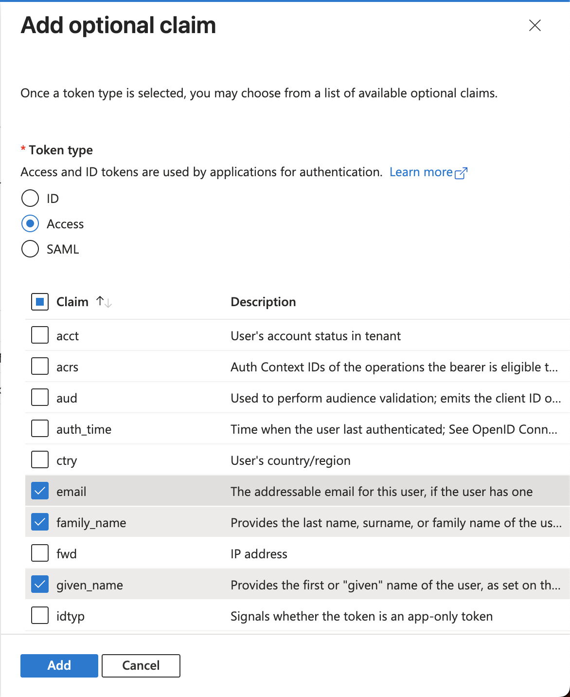 emailfamily_nameandgiven_nameclaims, then click Add on the bottom.