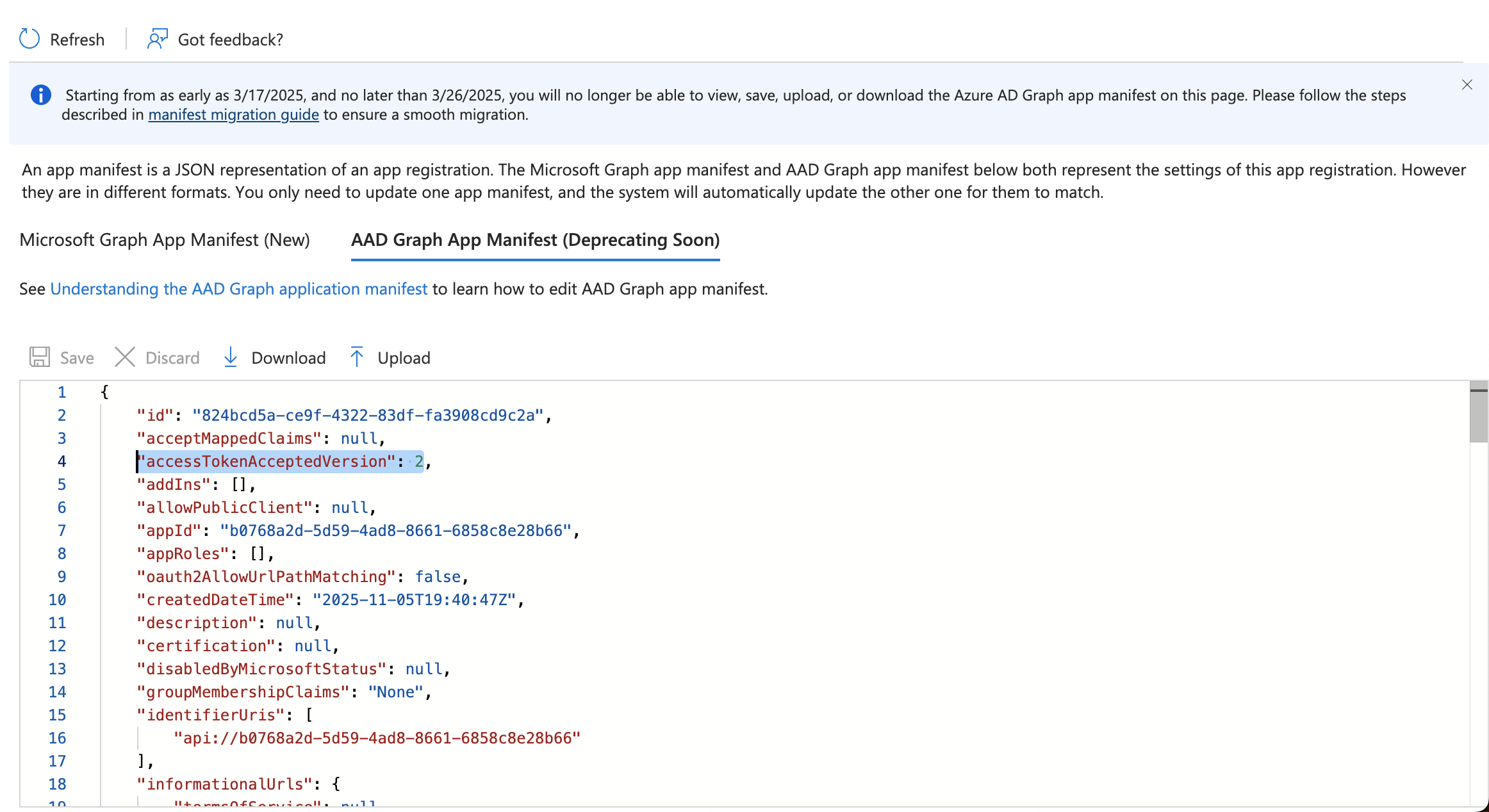 - Click on Manifest on the left side menu and click on tab AAD Graph App Manifest, then change the variable