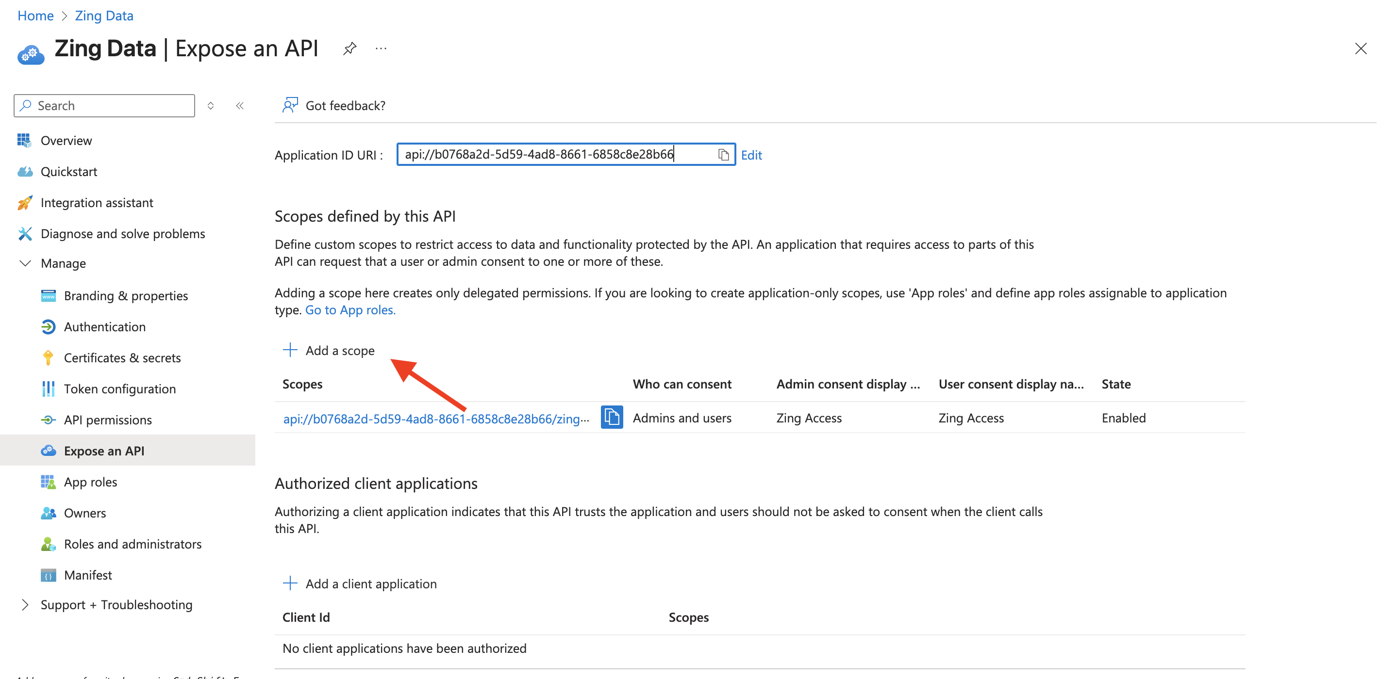 - Once the app is registered, we need to go to Expose an API on the left side menu.