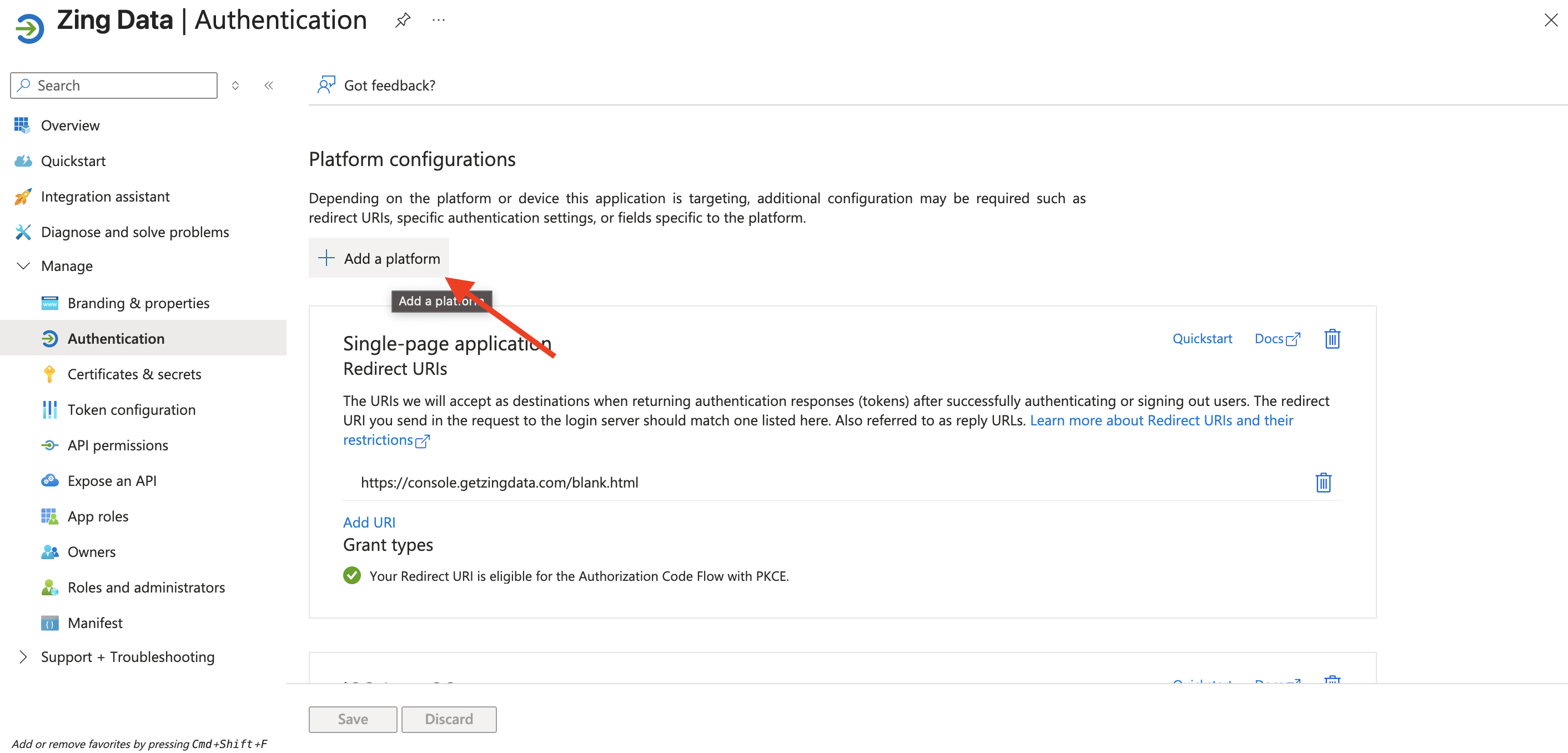 - Last step is to configure access to mobile applications. Click on Authentication on the left side menu and click on Add a platform (Single-page application with Redirect URIs should be already configured).